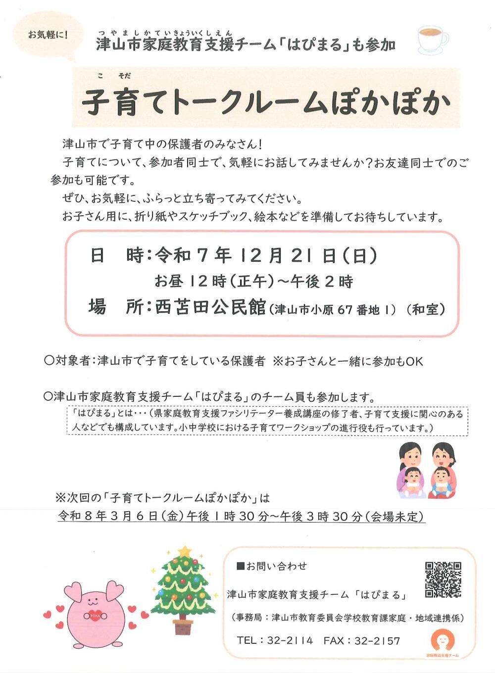 | お問い合わせ先 | 津山市家庭教育支援チーム「はぴまる」TEL.0868-32-2114 |