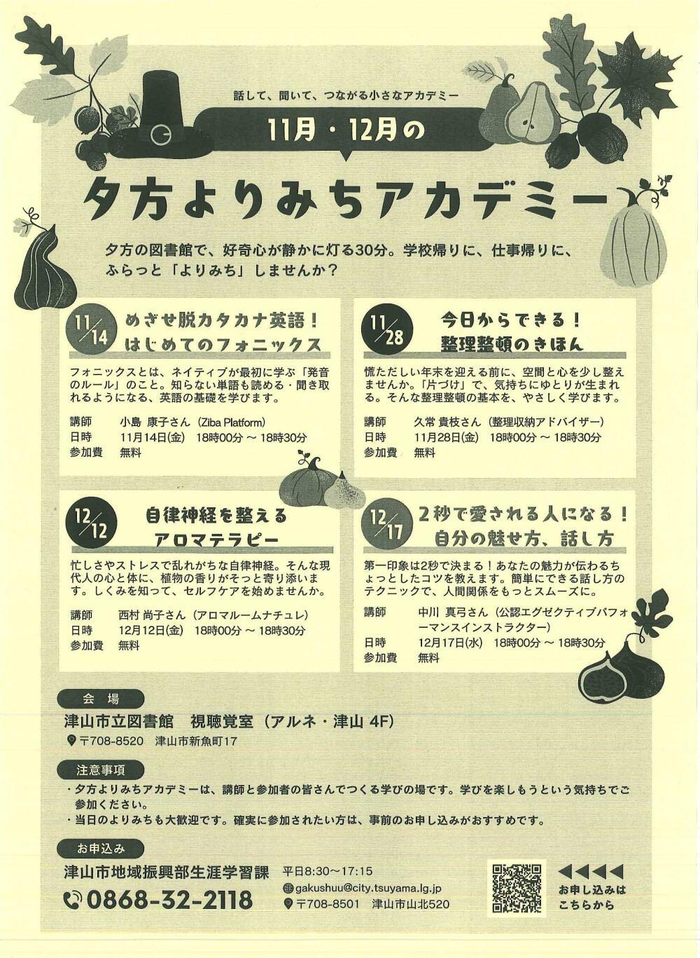 | お問い合わせ先 | 津山市地域振興部生涯学習課 TEL.0868-32-2118 |
