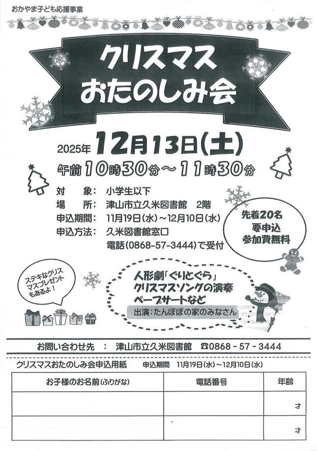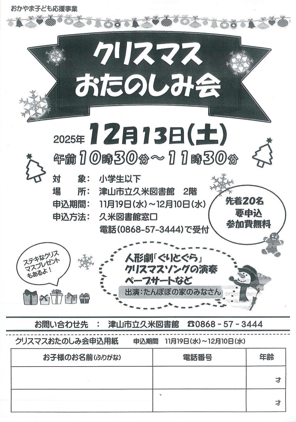| お問い合わせ先 | 津山市立久米図書館 TEL.0868-57-3444 |
