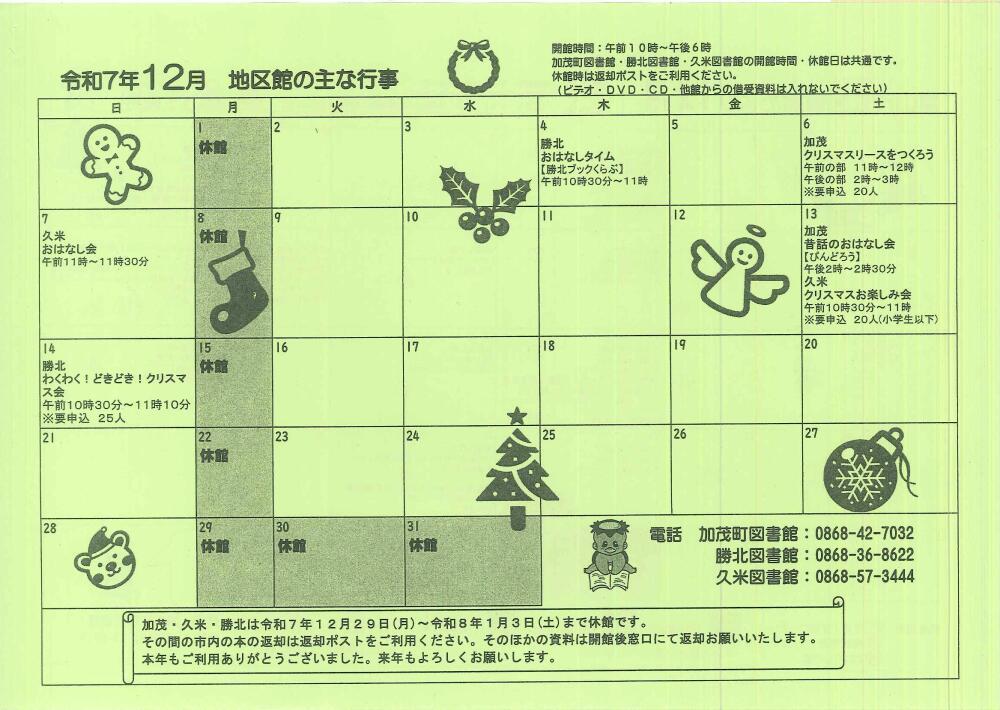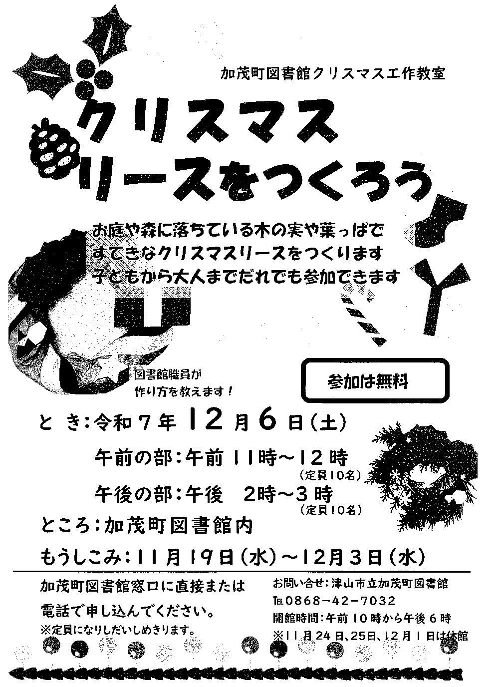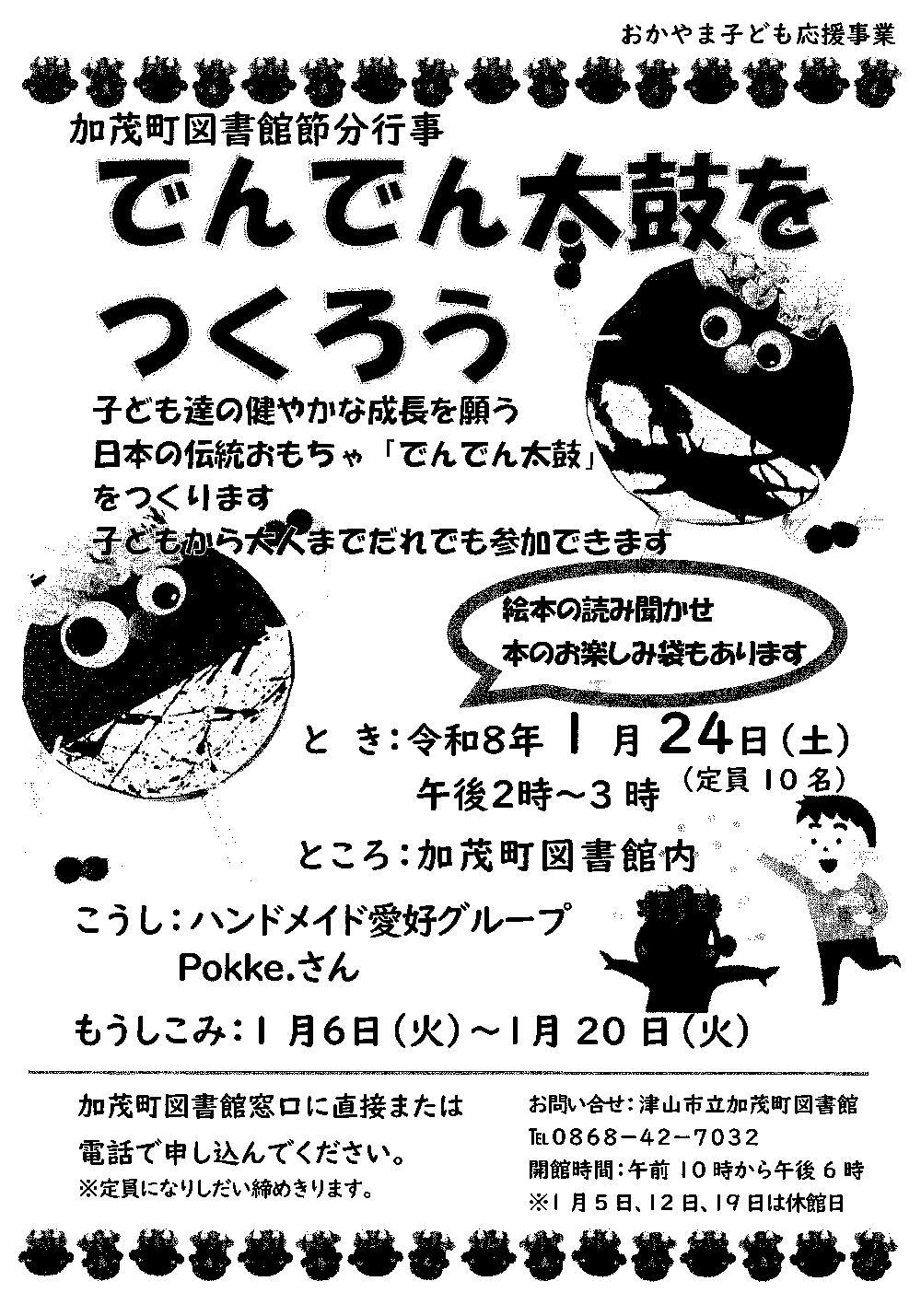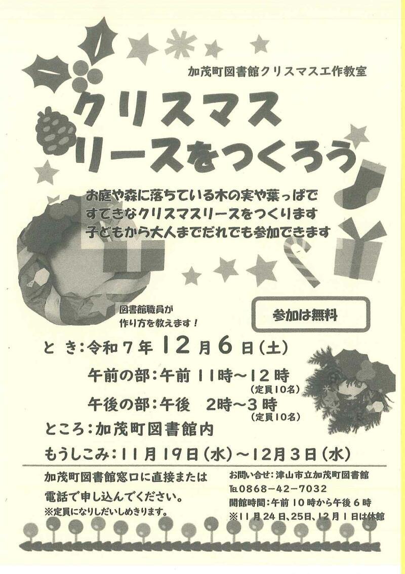 | お問い合わせ先 | 津山市立加茂町図書館 TEL.0868-42-7032 |