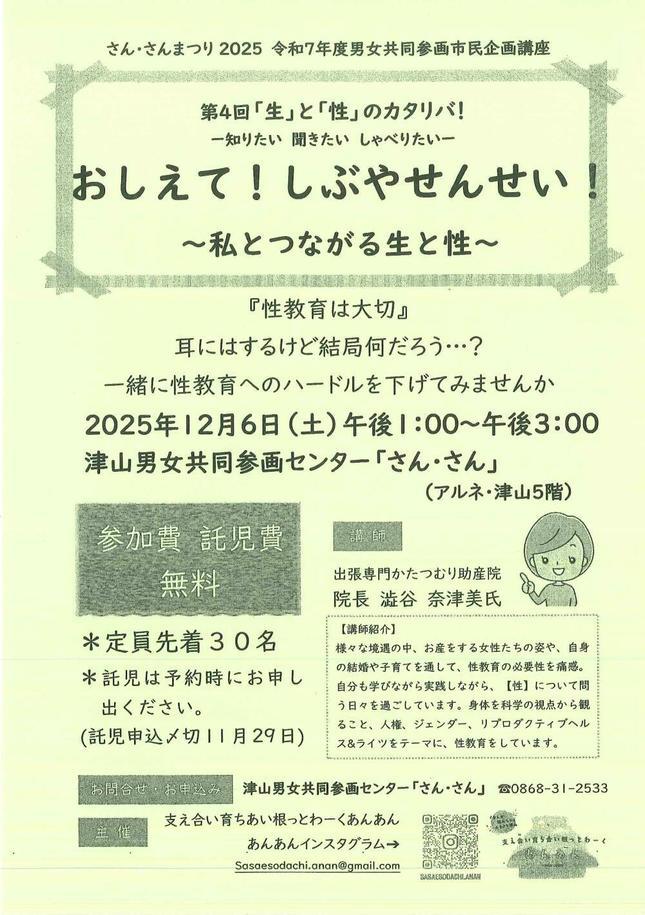 | お問い合わせ先 | 津山男女共同参画センター「さん・さん」 TEL.0868-31-2533 |